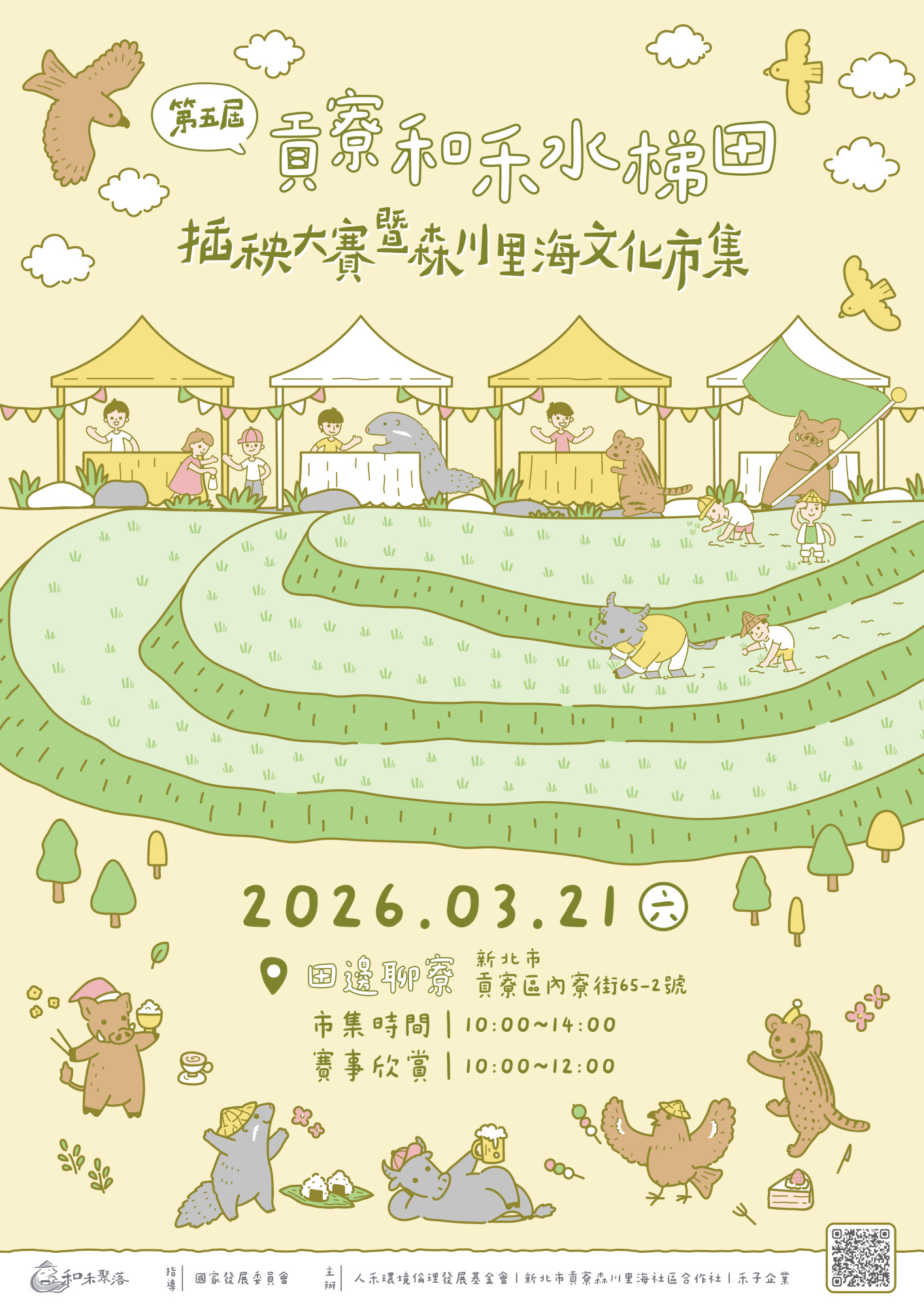 *農藝美學展演:一場職人與土地共舞的美學盛宴。 【專業農民賽】看國寶級老農如何瞬息之間,讓土黃泥地化為青翠稻田。 【業餘體驗賽】看返鄉青年與大地對話,承接這份厚重的技藝與責任。 *貢寮生活風格: 透過文化市集,直接向農民與職人採買,體現綠色消費。 【森川里海文化市集】匯集在地手作、山村農產與環境友善攤位,品嚐土地的原味。 【水梯田生態導覽解說】生態導覽探險,了解水梯田如何做為生物方舟,體現森川里海共好精神。